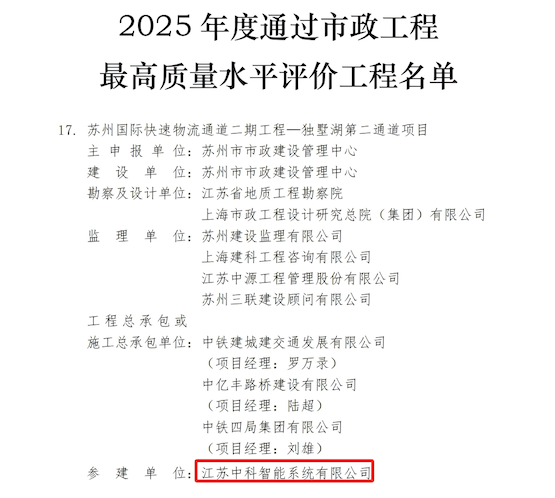 On July 22, 2025, the China Municipal Engineering Association announced the selection results. Jiangsu Zhongke Intelligent System Co., Ltd. (hereinafter referred to as "Zhongke Intelligent"), a subsidiary of Zhong'an Science and Technology, participated in the construction of the Suzhou International Express Logistics Corridor Phase II Project - Dushu Lake Second Channel Project, and was awarded the highest quality level evaluation project for municipal engineering in 2025.