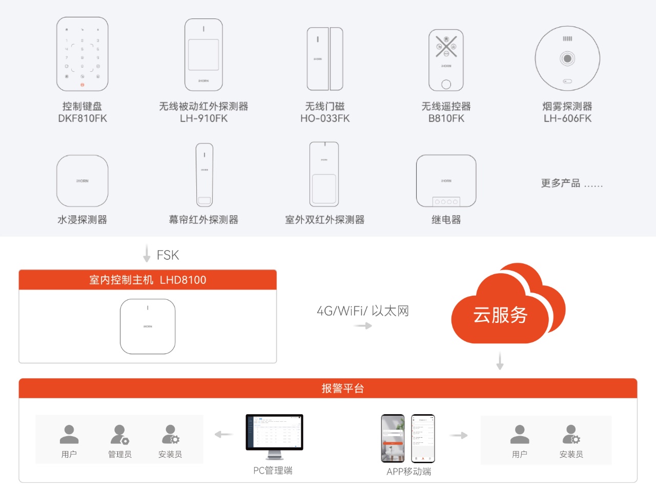 iHORN豪恩致力于打造“更安全、更穩定、更靈活”的專業報警系統,系統由報警主機、前端探測器、報警管理平臺組成。前端探測器一旦探測到異常情況,立即通過FSK通訊方式將數據上報至報警主機,主機再通過4G/WiFi/以太網等方式通知云平臺,現場聲光報警,并將報警信息通過PC管理端、電話、短信、APP等方式遠程通知終端用戶,保障各類場所人員、財產、物品安全。