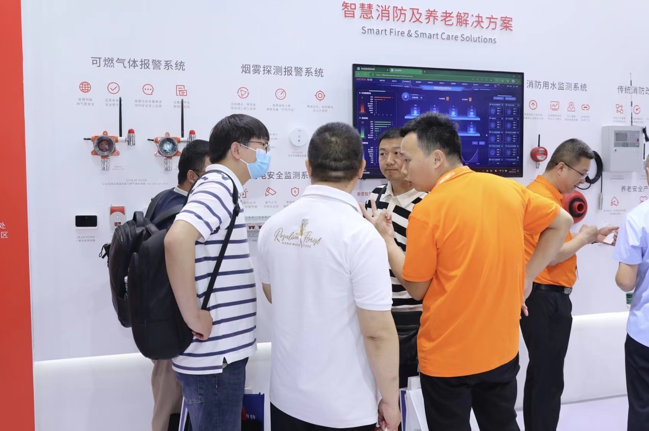 在展會左側墻面,智慧消防“1+N”解決方案成為了現場焦點,該解決方案涵蓋煙霧探測報警、可燃氣體報警、傳統消防改造等六大系統,可以實現水、電、煙、氣、火等在內的實時監測,建構“智慧消防火災防控一張網”。