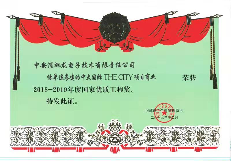 中安科股份子公司中安消旭龍電子技術有限責任公司(簡稱旭龍)參建的“中大國際THE CITY項目”摘得“2019年國家優質工程獎”。