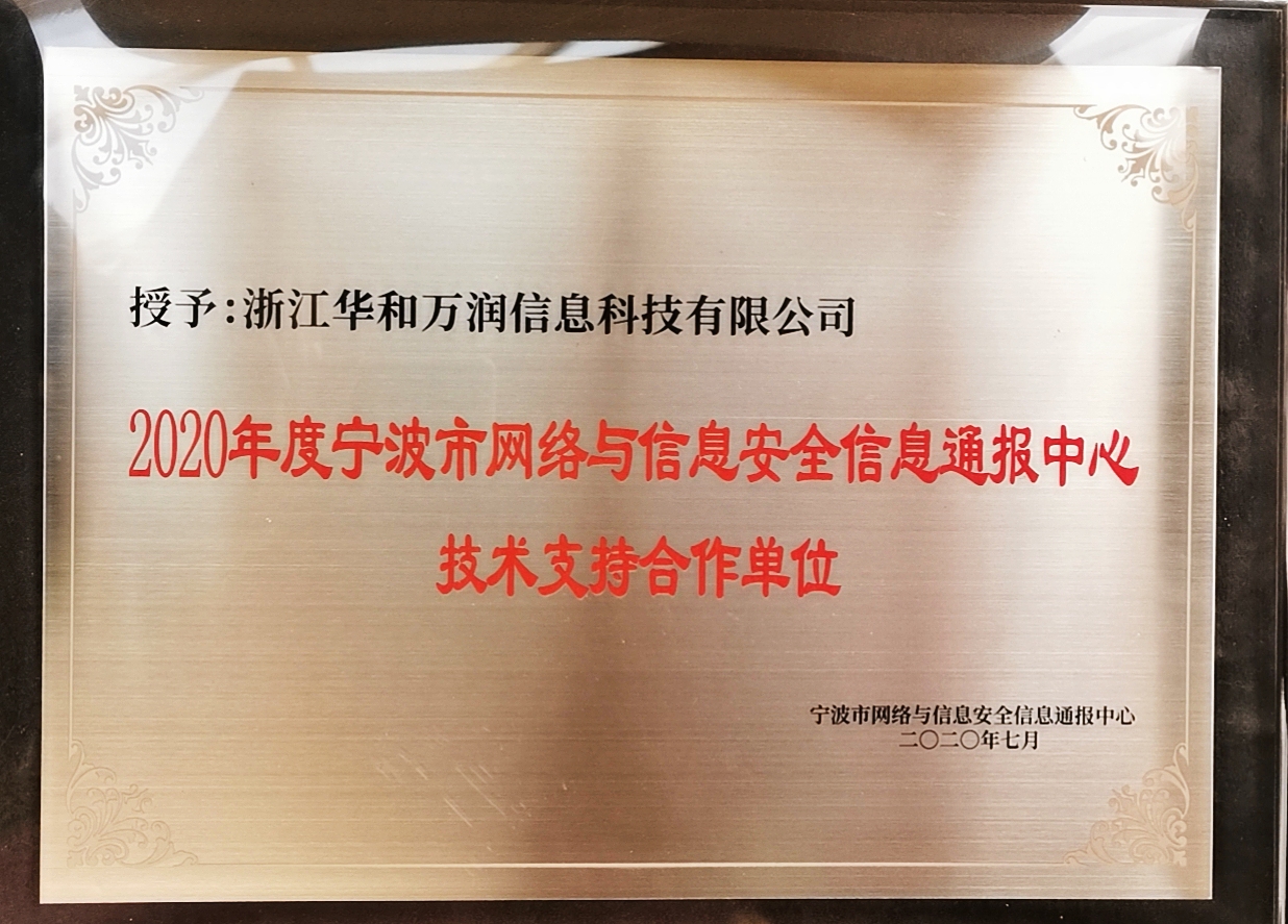 華和萬潤能夠榮獲「2020年度寧波市網絡與信息安全信息通報中心技術支持合作單位」、「2019-2020協會突出貢獻獎」,離不開政府、協會與客戶的鼎力支持。華和萬潤擁有全國性的服務體系,在北京、天津、上海、深圳、云南、湖北、河南等地設立了辦事機構,已發展成為一家業務覆蓋全國的高新技術企業。