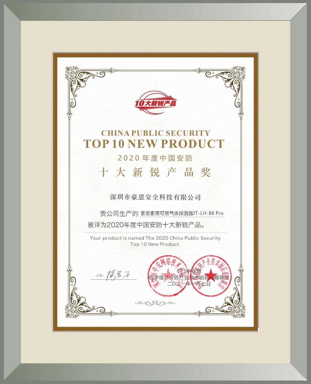 在團(tuán)拜會頒獎典禮上,中安科股份成員公司 — 深圳市豪恩安全科技有限公司(以下簡稱“豪恩”)的家用可燃?xì)怏w探測器 JT-LH-86 Pro 新品,榮獲了“2020 中國安防十大新銳產(chǎn)品”獎項,同時入圍的還有海康威視、大華、華為、天地偉業(yè)等公司的新品。