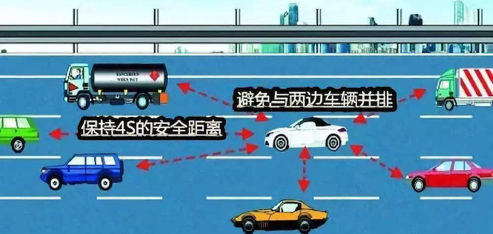 在駕駛過程中,可能會遇到前車突然停止、左右車道車輛突然變道的情況,所以要與前車保持至少4秒的安全距離。同時避免車輛并排行駛,使自己的車在前方或左、右至少一側留出空間,作為應急逃生區。
