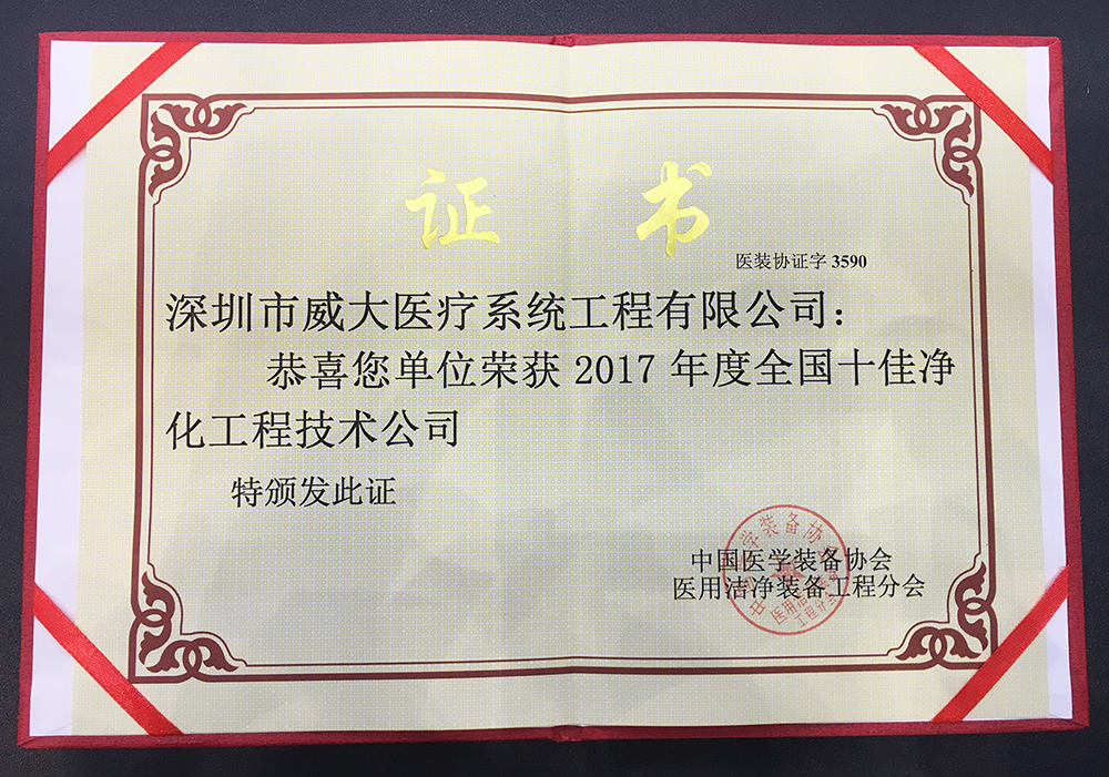 在稍后的頒獎典禮中,深圳威大憑借眾多標桿項目的實施經驗及豐富的系統集成能力,連續三年摘得“全國十佳凈化工程技術公司”的榮譽,并被主辦方授予“醫用潔凈裝備工程分會理事單位”的稱號。成立至今已有25年的深圳威大,已然成為國內綠色智慧醫院、醫療凈化系統的代表企業之一,系國家《醫用潔凈室應用規范》標準的起草單位、深圳市政府重點扶持的高新技術企業,擁有多項專利和知識產權,其自主研發生產的“手術室控制系統”,已廣泛應用于全國各類公共衛生及醫療機構。