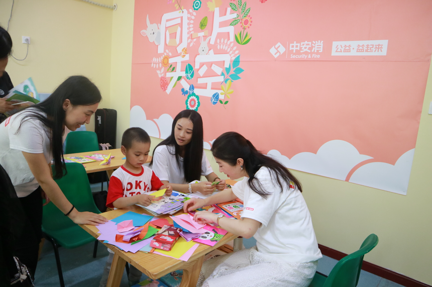 中安科愛(ài)心團(tuán)隊(duì)的志愿者們陪孩子們做各種手工活動(dòng)