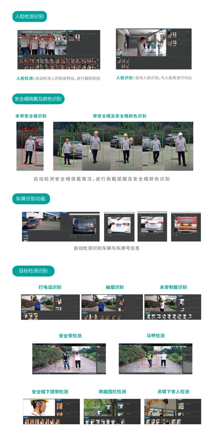 AI算法用于電力作業現場可實現人臉檢測、人臉識別、車牌識別、安全帽佩戴情況及安全帽顏色識別,以及打電話、吸煙、制服穿戴、安全帶佩戴、馬甲穿戴等多類目標檢測識別功能。