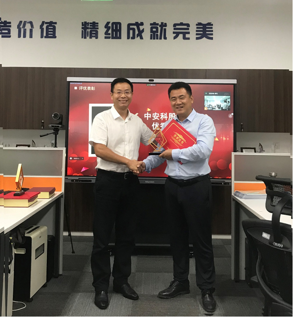 表彰大會(huì)上,由中安科股份副總裁兼深圳威大總經(jīng)理李振東先生為優(yōu)秀員工代表黃振財(cái)、李文浩頒發(fā)了獎(jiǎng)杯、榮譽(yù)證書及感謝信。